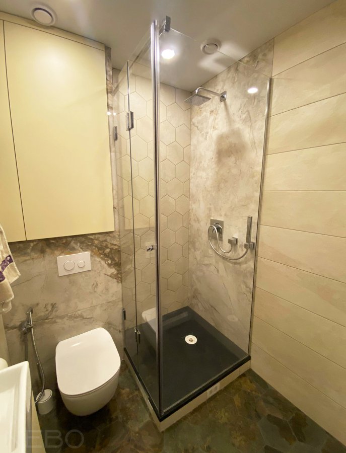 Угловая душевая перегородка с распашной дверью на поддоне