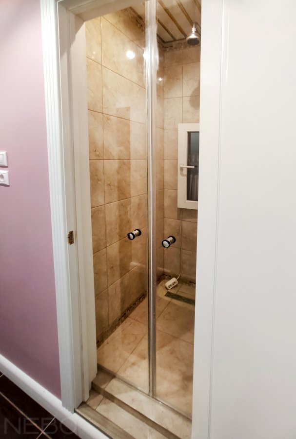Две стеклянные распашные двери для входа в отдельную душевую комнату облицованную плиткой